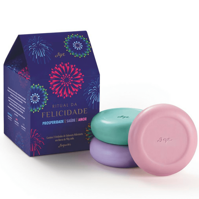 01 Estojo Sabonetes Ritual da Felicidade - 3x 90g. Caminho Olfativo: Oriental Vibrante, Floral Romântica e Floral Romântica