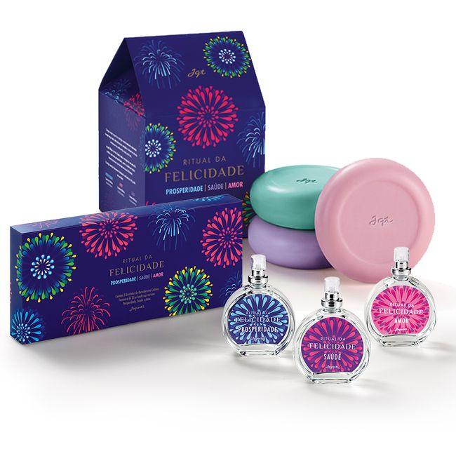 01 Estojo Ritual da Felicidade - 3x 25 ml. Caminho Olfativo: Oriental Vibrante, Floral Romântica e Floral Romântica